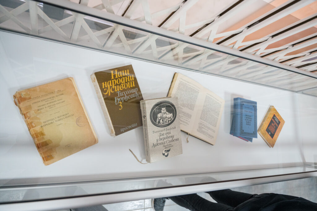Изложба “Вампир у народном предању” је настала истраживањем драгоцених сазнања о вампирима, које је прикупио истакнути српски етнограф Тихомир Ђорђевић. Верна интерпретација истраживачке заоставштине професора Ђорђевића, послужила је као основа приликом рада на овој изложби. Његове студије о оностраним бићима из митских прича, усмених предања и народне маште, представљају најбогатију етнографску базу за изучавање различитих фантазмагоријиских творевина на простору југоисточне Европе. Овом изложбом желимо да инспиришемо и изградимо свест о доприносу Тихомира Ђорђевића, научника светског гласа о очувању српског националног блага.